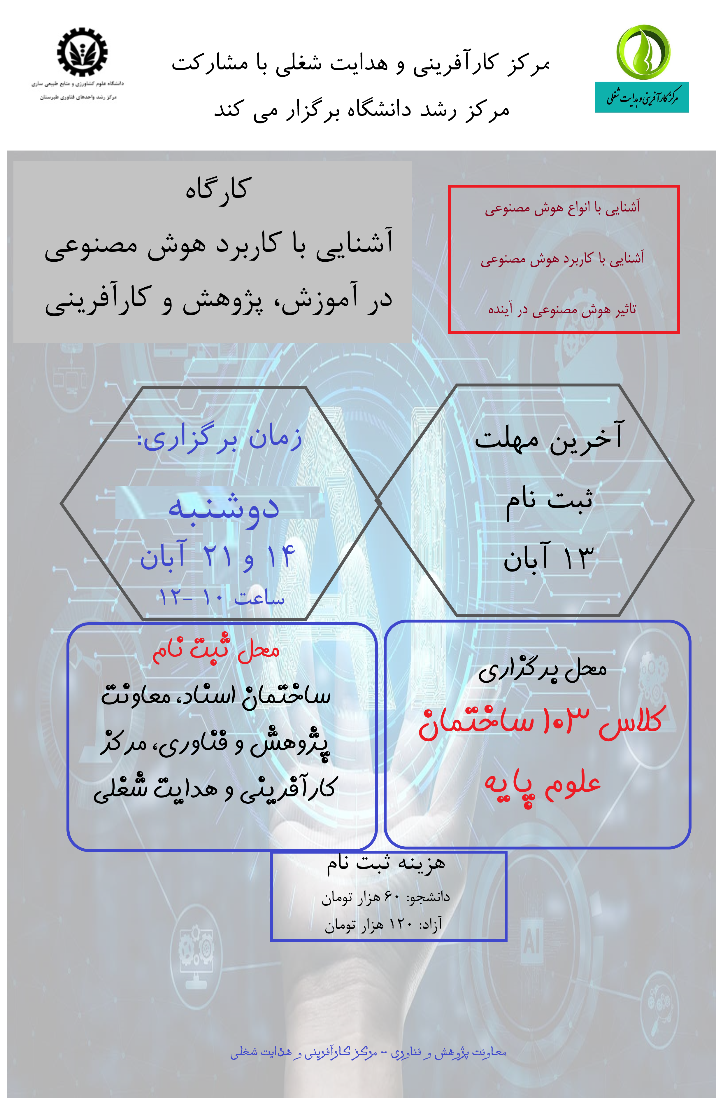 محل ثبت نام: ساختمان اسناد، معاون پژوهش و فناوری، مرکز کارآفرینی و هدایت شغلی