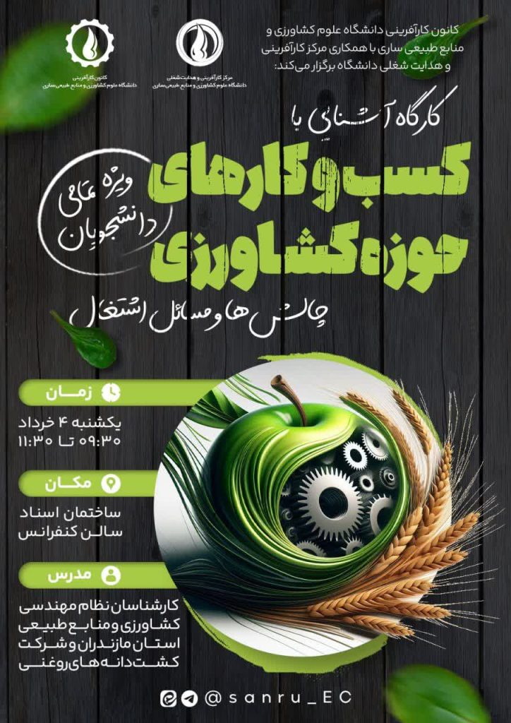 مرکز کارآفرینی و هدایت شغلی دانشگاه با همکاری کانون کارآفرینی دانشگاه علوم کشاورزی و منابع طبیعی ساری برگزار میکند